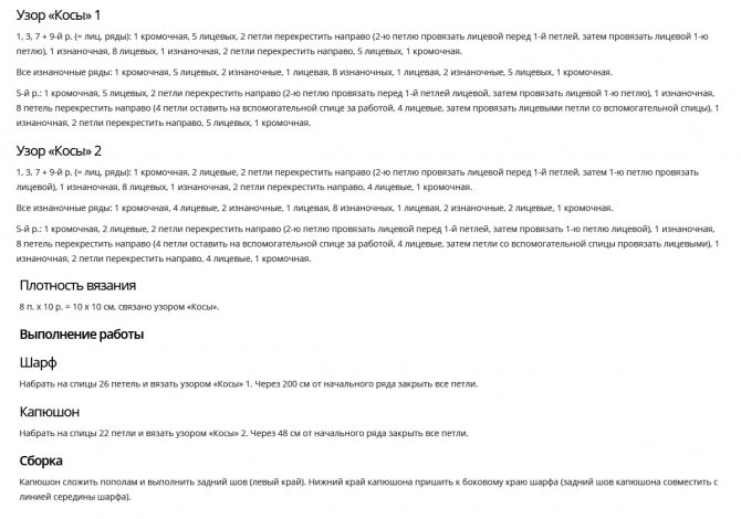 Размеры шарфа: длина 210 см, ширина 30 см. Размеры капюшона: 72х84 см.