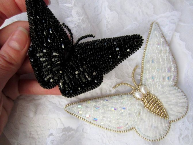 Бабочка-брошь, вышитая бисером, в самом простом варианте выполняется из 2-3 оттенков. Каждая бисеринка играет функцию пятнышка на крыле. Существует множество пошаговых мастер-классов, помогающих освоить технику бисероплетения. Со временем можно научиться делать настоящие шедевры. Для их создания применяются полудрагоценные камни, жемчуг, пайетки, стразы Swarovski, цветная канитель.