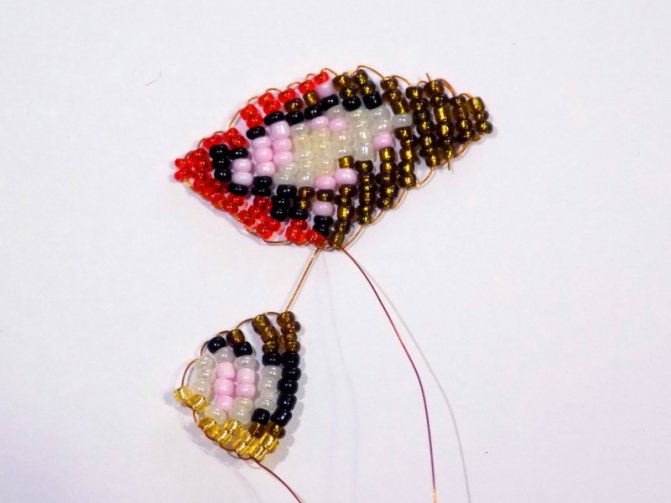 Для создания нижних крыльев концы основы раздвигают и на них нанизывают по 17 бисерин. Потом продевают концы в ближнюю к хвостику бусину и тянут их вверх.