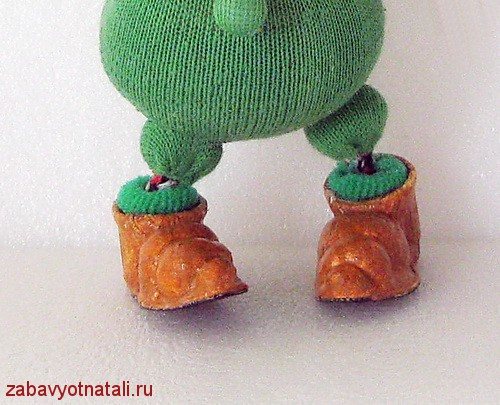 Для этого, первую утяжку сделаем около основания голени башмачков.