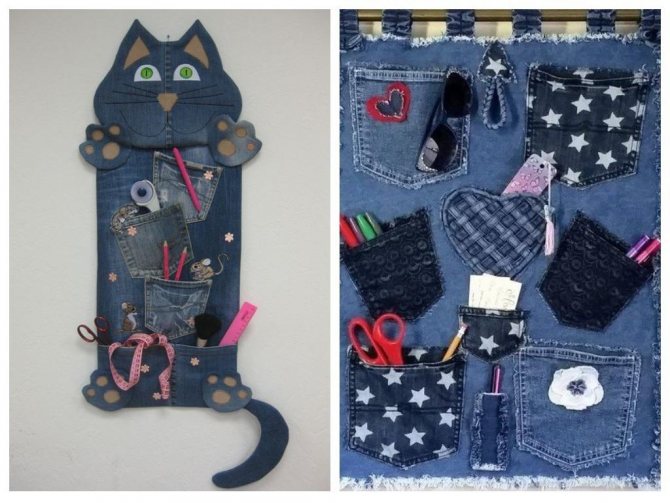 Еще одна практичная и довольно простая идея. Всяких очень нужных мелочей, которые хотелось бы упорядочить, хватает и у юной модницы, и у мамы-рукодельницы, и у подростка-школьника — удобный настенный органайзер из прочной джинсовой ткани всем поможет навести порядок и держать необходимые вещи под рукой.