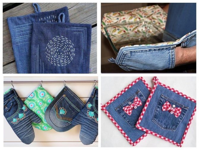 Их можно сделать совсем лаконичными и практичными, а можно украсить вышивкой или аппликацией и превратить в элемент кухонного декора — все в наших руках. Очень заманчивая идея — использовать ту часть, что с карманами: посмотрите, какие замечательные прихватки-рукавицы получаются (фото справа вверху).