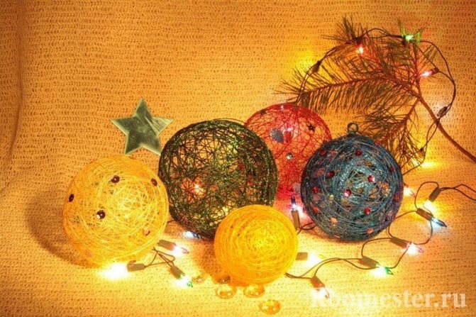 Давно используется способ изготовления шаров из нитей. Изделия получаются эффектные, поддающиеся дополнительному декору. Есть возможность варьировать размер.