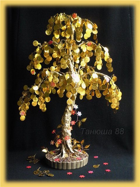 Денежное дерево из бисера сделанное своими руками, а не приобретенное в сувенирном магазине, обязательно привлечет в Ваш дом благосостояние и удачу. Талисманом китайской культуры по фен-шуй является именно такое дерево, которое является мощным средством привлечения материальных благ, при чем, состоящее не менее из ста монеток. Поскольку в нашей жизни деньги имеют немаловажное значение, людям свойственно верить в легенду про древо. Правда или нет, но, если периодически встряхивать изделие с монетами, Вы тем самым к себе привлекаете богатство и благополучие.