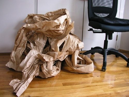 Бумагу разрезаем на восемь одинаковых частей. Поочередно сворачиваем каждую из них в два-три раза и прошиваем на швейной машинке с двух сторон.