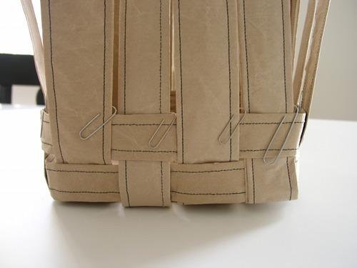 Начинаем формировать стенки корзинки. Для этого вплетаем новую бумажную полоску и фиксируем скрепками.