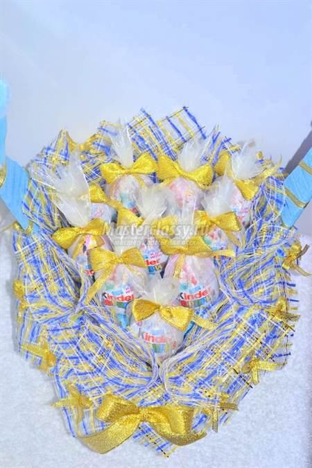 Количество используемых сладостей зависит от величины композиции. Если шоколадные яйца комбинируются с бисквитами Барни, другими кондитерскими изделиями или мягкими игрушками, их количество необходимо уменьшить.