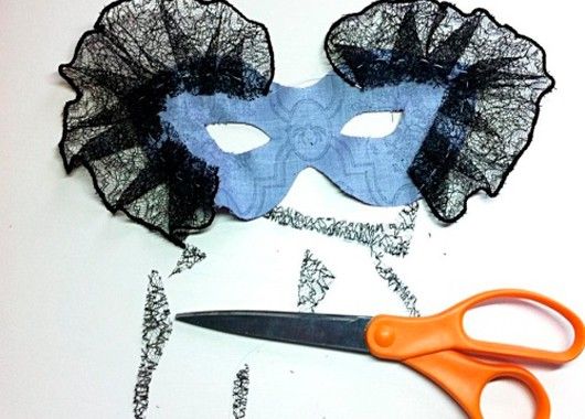 - Примерьте маску и посмотрите, какая длина лент нужна для завязочек. Отрежьте необходимую длину с учетом того, что ленты нужно будет завязать в бант или узел. Прикрепите ленточки к углам маски клеем или пришейте.