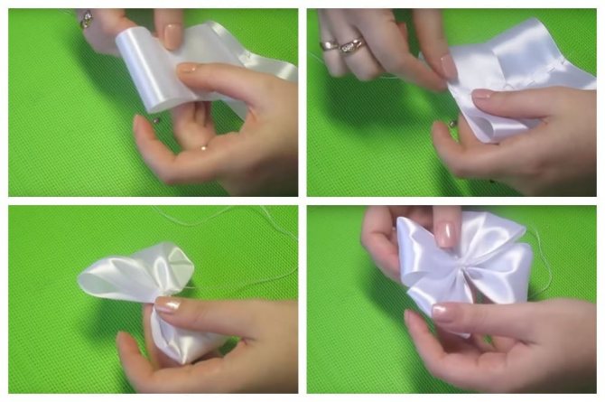 - Банты, расположенные на нитке аккуратно, стягиваем. Прошиваем их в центре, чтобы соединить всё и сохранить красивые складки. Завязываем узел, обрезаем нитку и расправляем складки.