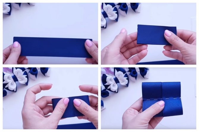 - Одну из синих лент складываем пополам, проглаживаем сгиб.