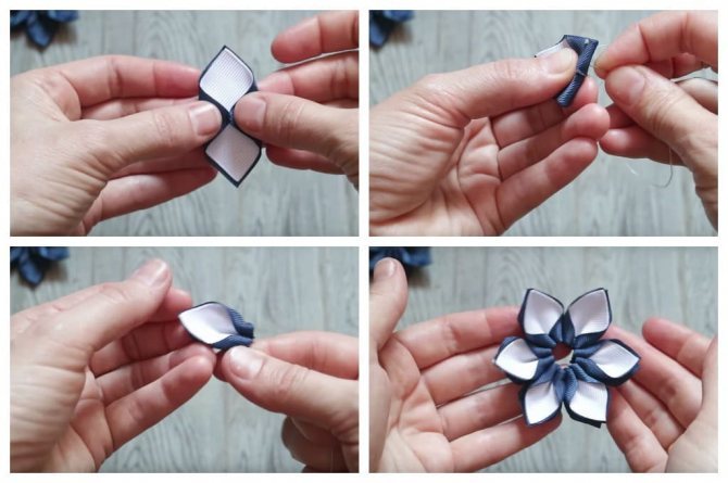 Готовые банты и цветы канзаши из лент могут стать частью резинки, заколки. Присоединять заготовку клеем непрактично и некрасиво. Крепление лентой выглядит гораздо аккуратнее, для этого: