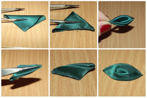 Разнообразить композицию помогут листики. Отрез зеленой ленты поворачивают изнаночной стороной. Левую сторону сгибают на 90° и накладывают сверху правый край. Отрезают, формируют две складки у основания, фиксируют, опаливают огнем. От длины ленты зависит размер листика.