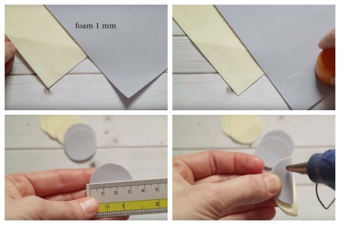 - Переходим к синему материалу. Здесь края нужно склеить пистолетом. Сразу склеиваем их и на одной, и на второй заготовке. Получились круглые детали.
