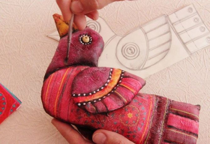 Теперь необходимо поделку поставить на специальную подставку и тщательно прокрасить. Оставляем туловище птицы до полного высыхания краски, а затем через проколы вставляем леску и подвешиваем ее в любом месте – будто она парит в воздухе.