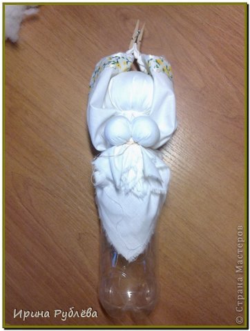 Руки кукле поднимаем вверх, временно закрепляем. Делается это для того, чтобы впоследствии руки не были как бы притянуты к туловищу. Грудь прикрепляем ниткой, точнее, приматываем. Для этой работы больше подошла бы бутылка » с талией», но я использовала обычную, тоже ничего.