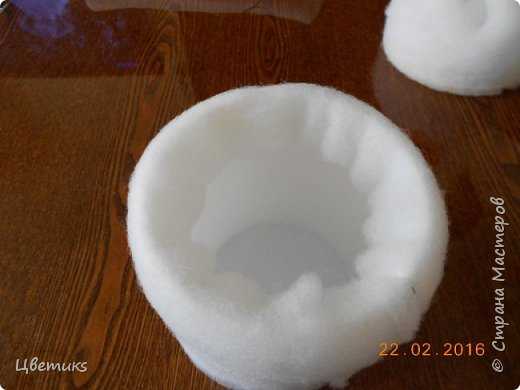 Отрезаем нужный нам кусок синтепона и оборачиваем им емкость (ведро). Два дополнительных (2 см) загибаем по краю ведра. Чтобы край был мягким и красиво выглядел под тканью.