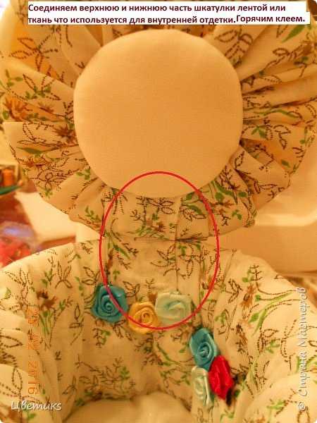 Чтобы придать поделке особое очарование — создайте изящную шляпку. Собираем кружево в круг, ленту прострочим и сделаем сборку. Теперь склеиваем две детали, можно добавить бантик. Такая куколка-шкатулка станет отличным презентом.