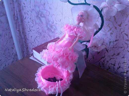 Для высшей части пригодится древняя куколка, можно взять Барби, емкостью для хранения будет служить пластмассовая бутылка. Для отделки будет нужно кружево, полосы шифона, атласные ленты 3 и 1 см.