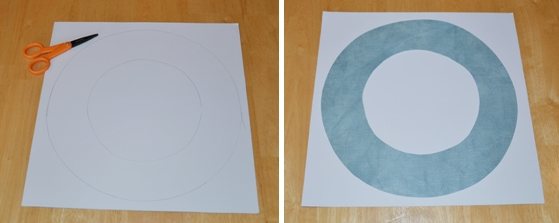 6. Разложите на столе картон, предназначенный для полей шляпы. Положите на него обычную суповую тарелку и обведите ее контуры карандашом. Затем поставьте в центр круга ваш цилиндр и тоже обведите. Вырежьте получившийся «бублик».