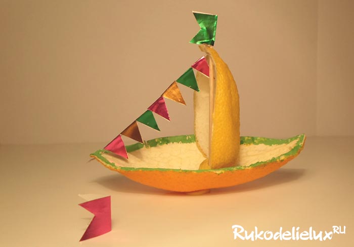 Остались корочки от апельсина или лимона? Из них можно сделать ароматные кораблики! Для этого понадобится немного времени и некоторые умения. Зато ребёнку будет очень интересно выполнять эту поделку из фруктов, а кораблики можно запускать в ванной с водой, они будут плавать!