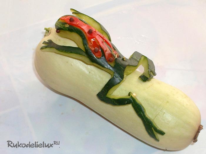 У нас нашёлся только кабачок, и всего пара часов, чтобы из него что-то изобразить. Покрутили, повертели, решили сделать ящерку, цвет вдохновил. Да и делать её просто и совсем не долго.