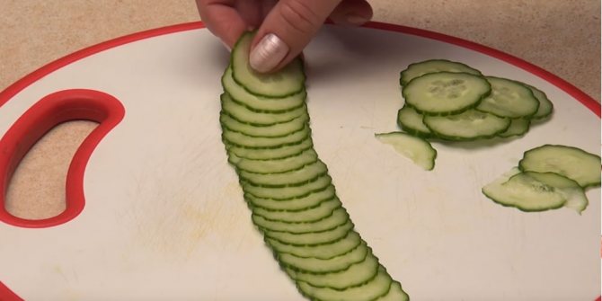 1. Нарезать огурец тонкими кружочками и выложить их в ровную линию.