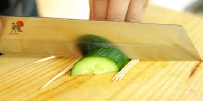 3. По обеим сторонам огурца положить несколько зубочисток и надрезать огурец, продолжая держать нож под углом 45 градусов, как и раньше. Убирать нож, как только он коснется зубочистки. Надрезы должны быть толщиной примерно 1-2 мм.