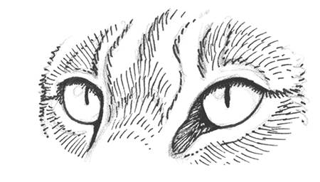 Много коротких штрихов, нарисованных очень близко друг к другу, тонко оттеняют в некоторых областях, таких как пространство между глазами и за внешним краем глаз.