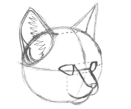 4. Добавьте передний край ушей, треугольную подушечку носа и перевернутую V-образную форму для обозначения рта.