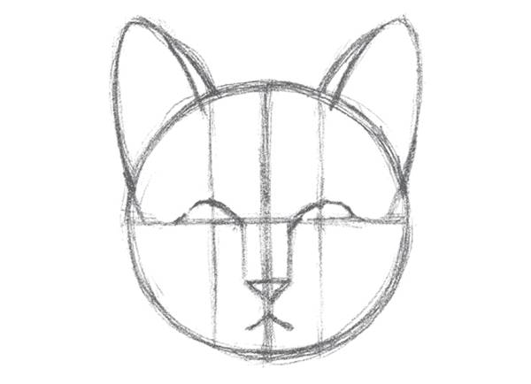 Обратите внимание, что существует почти воображаемая линия, идущая от внутреннего угла ушей к внутреннему углу глаз и вниз к внешнему углу подушечки носа. Эти (частично) воображаемые линии создают пространство между ушами, глазами и носом кошки, которое сужается по мере того, как оно стекает к носовой подушечке. Имейте это в виду, когда рисуете лицо кошки под любым углом.