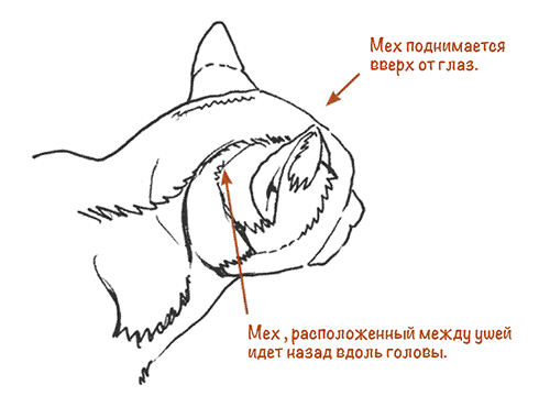 Обратите внимание на полосу меха, проходящую от внутреннего края уха до другой стороны. У внутреннего основания уха есть небольшой участок более короткой шерсти, который иногда виден. Обратите внимание, всегда ли вы рисуете его или нет.