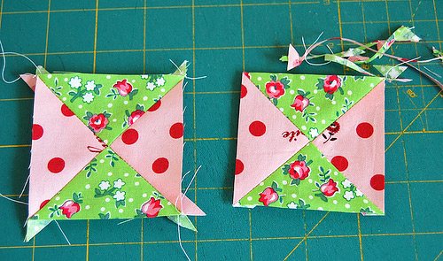 Специальный резак (недешевый, между прочим) к такому шаблону не нужен: даже очень тонкая и «тянучая» ткань совершенно точно обрезается бритвенным лезвием. К примеру, всего одного такого составного шаблона достаточно, чтобы нарезать лоскутов для весьма эффектного одеяла в стиле флик-фляк (справа на рис.).
