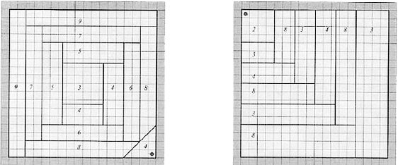 Стандартные размеры блока пэчворка от 10х10 до 30х30 см с шагом в 5 см. Простые схемы блоков пэчворка, как, напр. угловая спираль и лесенка, можно составлять самостоятельно на клетчатой бумаге, см. рис.; цифрами обозначаются номера расцветок тканей согласно выбранным образцам. Размер блока получается исходя из наименьшей допустимой ширины элемента узора по лицу, равной 1,5 припускам на подвертку, т.е. для большинства тканей 15 мм (см. далее, о технике шитья).