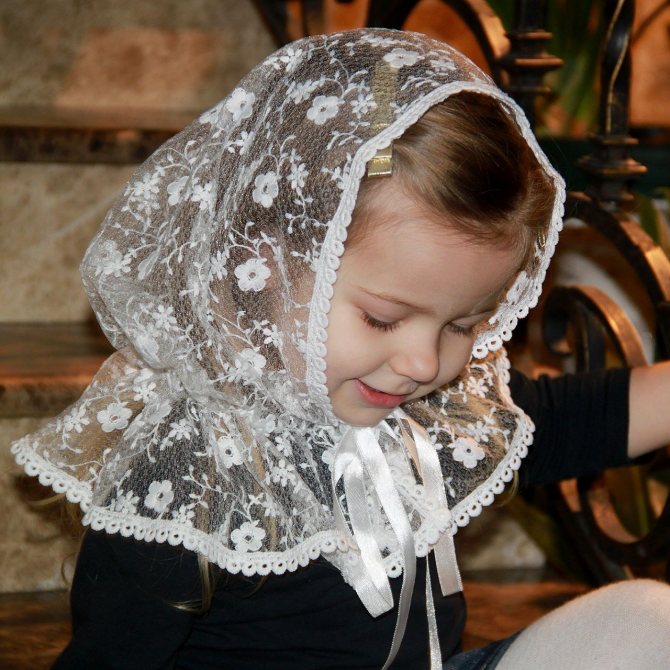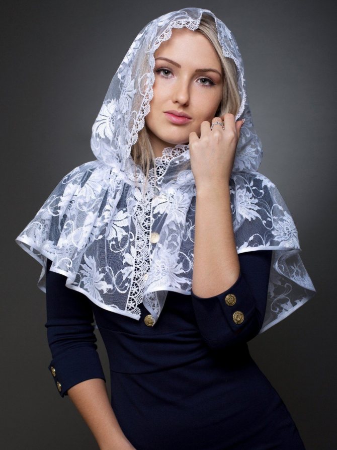 Для праздничного дня желательно иметь белую кружевную накидку, если поход в церковь выпал на день траура или поста, то убор должен быть черного или коричневого цвета.