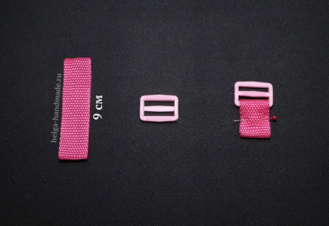Приступаем к изготовлению лямок для рюкзака. Для этого используем пластмассовые рамки (перетяжки) и стропу, от которой отрезаем 2 полоски по 9 см. Стропу вставляем в рамку, подгибаем края стропы с обеих сторон и фиксируем булавкой. На видео выше этот процесс показан подробнее.