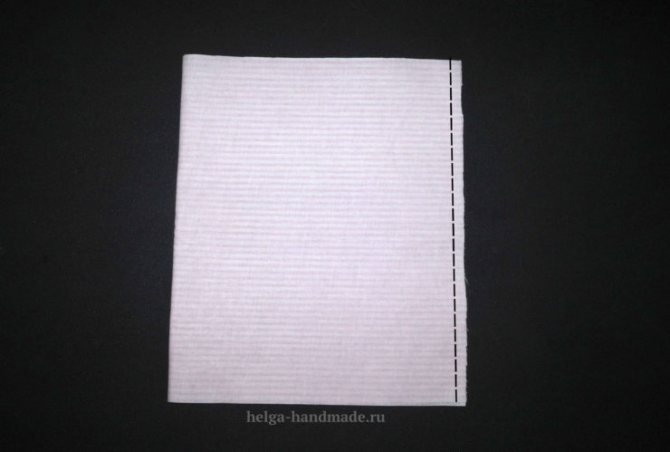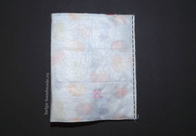 Теперь приступаем к основной детали подклада. Прямоугольник ткани тоже сгибаем вдвое и прострачиваем с изнаночной стороны, где отмечено пунктирными линиями.