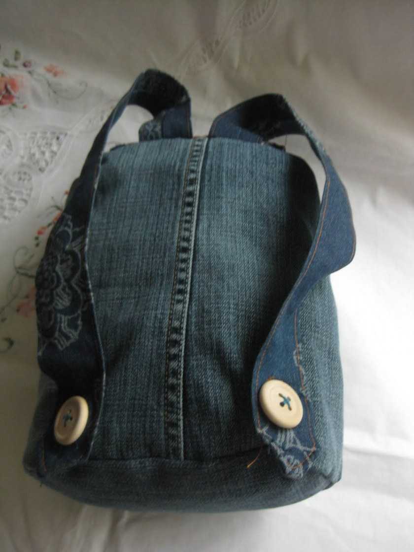 Сшить такую модель рюкзака-мешочка будет под силу даже неопытной рукодельнице. Выбрать в качестве основы старые джинсы не только практично, но и интересно: на них уже есть декоративные строчки и кармашки, которыми можно воспользоваться. Размер готового рюкзачка будет зависеть от ширины штанины джинсов.