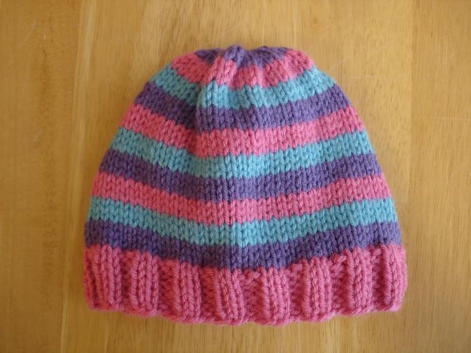 Двухцветная шапочка может быть любой модели, поэтому ниже будет описан общий способ ввода нити другого цвета.