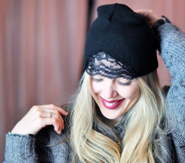 Такой вариант представляет собой яркий пример того, что можно удачно сочетать несочетаемое. Необходимо использовать шапку чёрного цвета, а также маленький кусок кружева. А также нельзя забывать про нитку с иголками, острые ножницы.