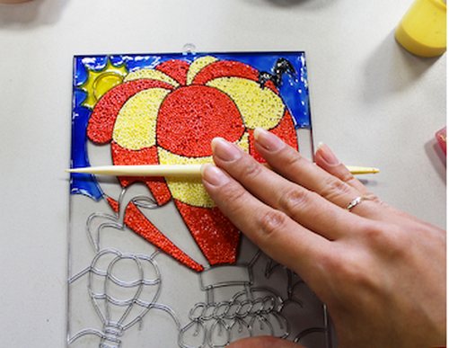 • Подложите под прозрачную основу рисунок и по готовым линиям нанесите контуры витражными красками нужного цвета. Перед дальнейшей работой дайте контурам застыть. Некоторые части аппликации заполните витражной краской (как на фото).
