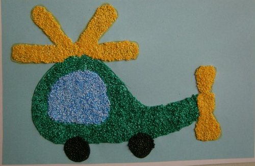 из шарикового пластилина. Это достаточно простая поделка, которую сможет выполнить даже младший дошкольник (конечно не без помощи взрослых). Нужно подготовить шариковый пластилин, стеку (лопатка для лепки), лист картона формата 4А, шаблон вертолета, простой карандаш, фломастеры.