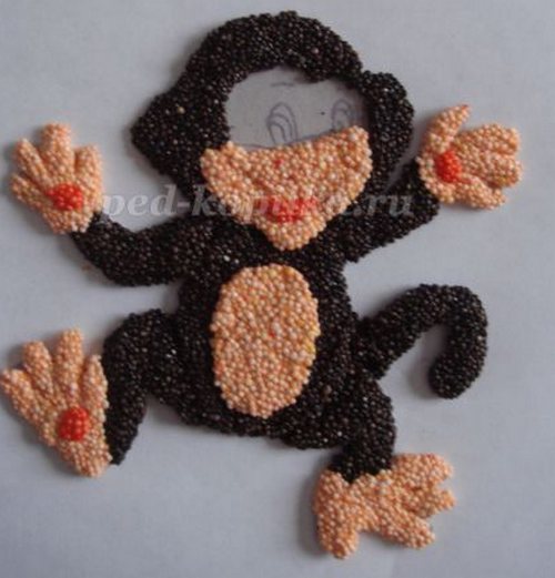 • Красным пластилином раскрасьте щеки, приклейте обезьяну на картоне с помощью самоклеящейся бумаги на магнит. Готово!