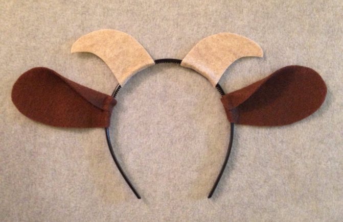 Ободок можно заменить шапочкой из плюша. Замеряем окружность головы ребёнка. Размечаем на ткани выкройки, вырезаем. С изнаночной стороны сшиваем на швейной машинке. К головному убору пришиваем ушки и рожки. В области лба также можно разместить глазки. Шапочка готова.
