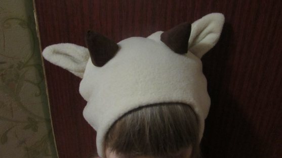 Подпарываем шов на шапочке по бокам в двух местах и на макушке в двух местах. Вшиваем ушки и рожки. Чтобы рожки были загнуты в разные стороны, один из боковых швов рожек прогладьте пальцами сильно. Пришейте атласную ленту по нижнему краю шапочки.