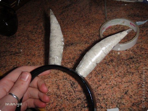 набила туалетной бумагой. при помощи двойного скотча закрепила на обруче. для надежности обмотала и простым скотчем еще раз. детские костюмы сами детки крутя-трепят так, что они должны быть супер устойчивы))) хотела оставить так, но рожки не естественно блестели.