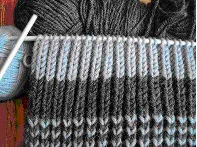 Наберите темно-серой ниткой 39 петель и вязать далее узором, выполняя смену нити по описанной последовательности смены рядков. Затем часть шарфа вяжем темно-серой нитью и связав примерно 95-120 см от начала, вяжем снова полосы, но в обратной последовательности.