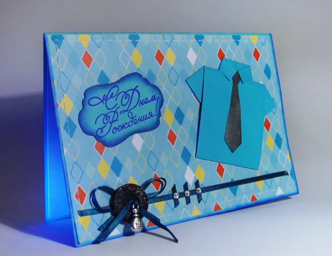 Для папы не нужна открытка с множеством мелких витиеватых деталей. Простота и лаконичность – вот главный девиз таких поделок. Минимум ярких цветов – лучше выбрать 2-3 «мужских» оттенка и приступать к работе.
