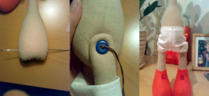 Шаг седьмой — взять спицу и с ее помощью отмерить, где к туловищу будут присоединены ноги. Через отверстия пуговиц пришить ноги к туловищу. Трусики рационально также сразу пришить к туловищу.