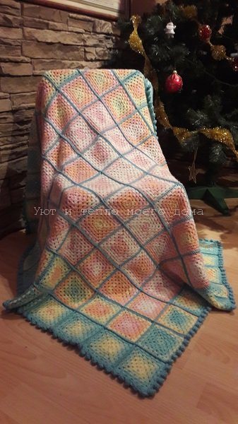При вязании пледа, подушки этот способ соединяет все квадраты в единое полотно без отрыва нити. Не законченной остается только одна сторона изделия, которая для завершения работы обвязывается арками по всей длине сразу.