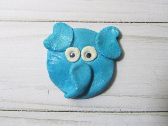 - Отщипнуть кусочек синего теста, от того, который был отложен ранее, и вылепить из него хоботок. Приклеить капелькой воды. Палочкой или зубочисткой сделать носик на конце хобота.